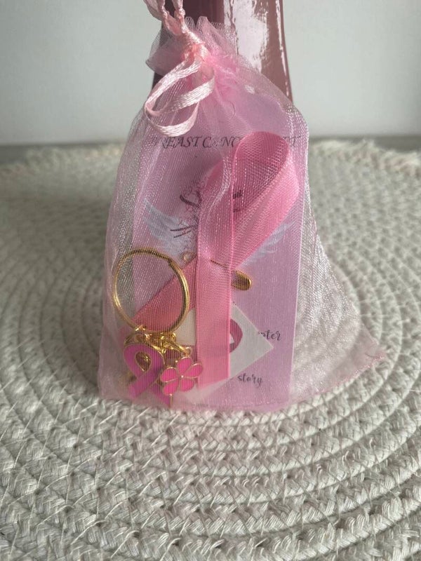 -un ruban rose, un porte clé, un tatouage et une petite carte.